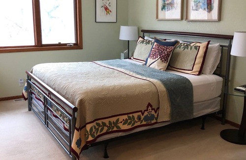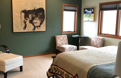 Loya's Little House B&B sits on 12 acres of Grandad's Farm just north of Des Moines and Ames, Iowa. The beautiful four bedroom, four bath house is surrounded by landscaped gardens and flowing water features. Our two farms have a total of 5 miles of trails to explore. Access to the river for kayaking or canoeing is available on site, one mile north, and one mile south. Families can use the big, fully equipped kitchen for preparing meals. The house also includes lovely furnishings and original artwork. By booking the entire house, guests have exclusive access to the house's common living areas. Our place is good for families (with kids) and big groups.