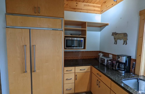 Upstairs, you'll find two bedrooms with queen beds, adorned with fantastic picture windows that offer scenic views. One of the bedrooms also includes a dedicated guest workspace and a cozy sitting area, where you can savor the tranquility of a quiet morning with a cup of coffee and a good book. Please note that the bedrooms are private but have a passthrough at the ceiling, so they are not completely soundproof.