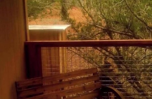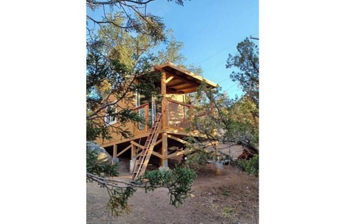 Our wonderful tiny cabin treehouse is a true delight. Glamping is the best description. Powered by solar panel and propane. Toilet is a very clean, fresh each guest, outhouse.