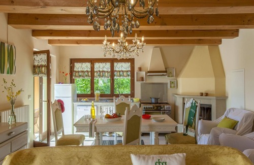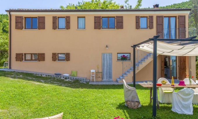 This charming villa near Pergola offers a peaceful countryside escape for up to eight guests, surrounded by vineyards and olive groves. With two kitchens, three bedrooms, three bathrooms, and a private pool (open May–Sept), it’s perfect for families or groups seeking space and comfort. The fenced garden, sun loungers, and outdoor barbecue area invite alfresco dining and lazy afternoons, while free Wi-Fi and cozy furnishings add modern convenience.