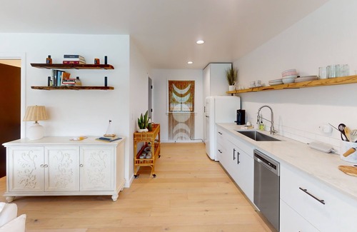 Begin each day outside on the deck, the perfect, quiet spot to sip your morning coffee and watch for passing otters, eagles, and osprey. Inside, there's a chic and open kitchen with a Smeg refrigerator, a gas range, and other stainless steel appliances, where you can fix a bit of breakfast to enjoy with a view of the water.