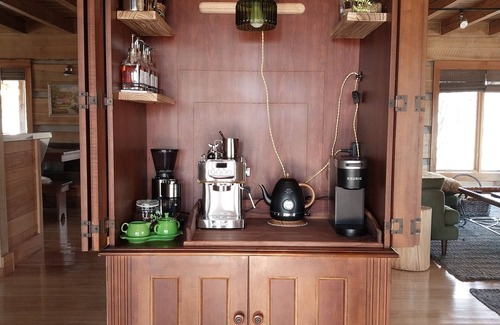The cabin boasts 2200 sq. feet of well designed and appointed comfortable interior furnishings. A gourmet kitchen is stocked for cooking with all essentials. Complimentary coffee & tea from Brown County Coffee - loose leaf teas from Nelson's Teas are located in a stocked coffee bar armoir. Celebrating a special occasion? Have a custom cake, and celebratory banner placed, ask about pricing and options.