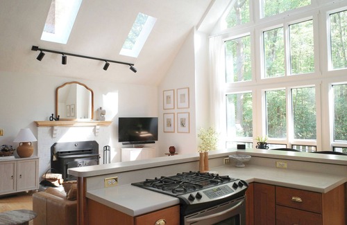 As you step inside, you'll be greeted by an expansive main level, where the living room, dining area, and kitchen flow seamlessly into one another, creating an inviting space for both relaxation and entertainment. At the heart of this open space is the magnificent floor-to-ceiling A-frame window in front of the dining table that brings the outside in and offers a calming backdrop for your meals. The kitchen is fully equipped to host everything from intimate dinners to festive gatherings. The living area features a TV complemented by a high-quality soundbar, creating an immersive entertainment experience. Lastly, the charming wood stove style fireplace casts a warm glow, adding a touch of rustic elegance to your gatherings.