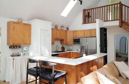 The main floor is also home to the primary bedroom with a comfortable king size bed, featuring a full bath, a walk-in closet and the convenience of an in-room washer and dryer. The room also features sliding doors that open to reveal a secluded bistro-style table and chairs for two on the deck, nestled under an overhead trellis. This idyllic spot is perfect for savoring your morning coffee or enjoying an intimate breakfast while surrounded by the serenity of the forest. Back inside, the bedroom also includes a TV, ideal for relaxing movie nights.