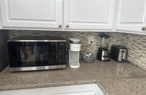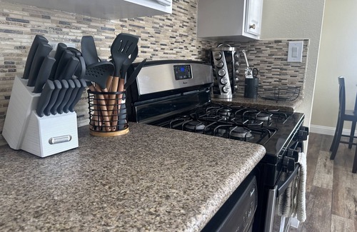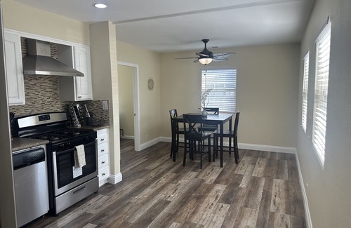 Modern, updated, and spacious kitchen stocked with all of the cooking essentials! Dining table with seating for four. Queen sized pull out sofa in living room that sleeps two guests.