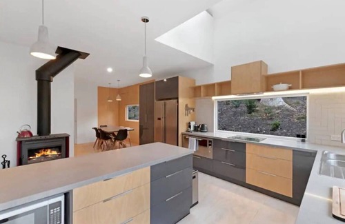 Those seeking a tranquil and immersive nature experience as a couple, a family or a group of friends look no further. Every window in this stunning passive home offers views of the nearby native bushland with flourishing ferns, a seasonal creek and Tasmanian wildlife.