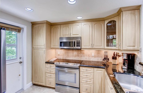 The updated kitchen has everything you need. The cabinets, granite counters, and mosaic tiles create the perfect place for making a group dinners—just add some fresh, local seafood and you’re all set. Then head over to the modern dining table (seats 6) and enjoy a meal with friends or family.
