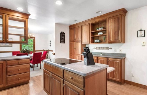 The stunning kitchen is fully equipped with all the essentials you need to whip up a delicious meal, including a kitchen island cooktop, oven, microwave, refrigerator, trash compactor and dishwasher.