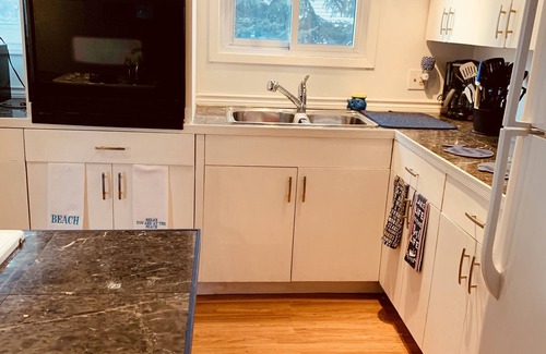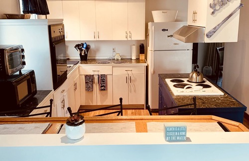 "Beachfully "decorated open concept living area with large kitchen. This cottage can accommodate up to 5 people with use of the daybed or air mattress. Main floor bedroom with queen bed and view of the lake from living room sliding door . The second storey boasts a large tranquil bedroom with a queen bed and day bed. There is a large sliding door facing the lake to enjoy the amazing view of the lake or the breathtaking sunsets all while listening to the waves while you relax and enjoy this space. Both bedrooms are equipped with high quality brand new mattresses for your sleeping enjoyment along with all new bedding.