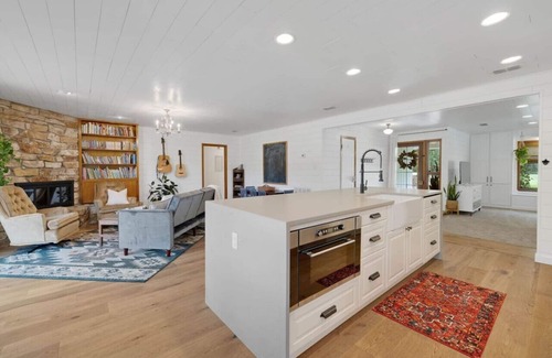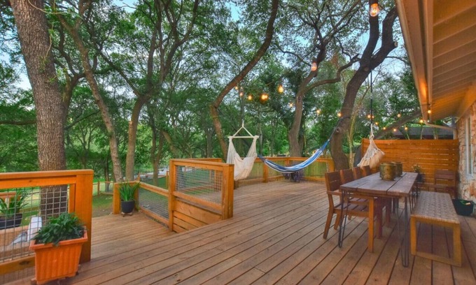 'Serenity On The San Gabriel'- 4br/2.5ba riverfront house with a fully-equipped kitchen, two dining areas (plus a kids’ table), two living spaces and a laundry room. Enjoy luxurious linens, comfy beds, Smart TVs, salon-quality shampoo, conditioner and body wash. Outside are large oak trees, hammocks, dining table, multiple seating areas, a large playset, tree swing, and kayaks provided for playing in the San Gabriel river. Same-day bookings!