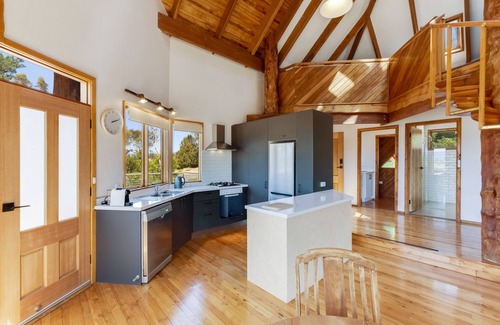 Take in the river view through the huge windows of the light filled space or watch the local wildlife grazing on the front lawn. Up stairs to the mezzanine bedroom you'll find a comfy queen bed with electric blanket. Also a fold out single bed if needed