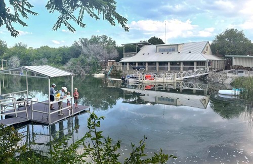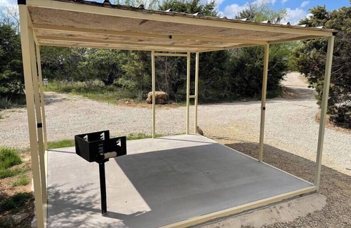 Located at Lake Godstone™ near Graford, Texas, our Serenity campsite is an RV campsite (RV not included) provided with water, sewer and 30 amp power hookup for a guest-provided RV. The secluded campsite has a shelter with large cedar picnic table and a charcoal grill. It features a large fire pit, a pad for a tent, and brook running through the campsite during rainy seasons. Free Wi-Fi and a short walk through the heavily wooded forest down to our large covered dock with awesome fishing and canoe, kayak, pedal boats and rowboat rentals. 250 LB Propane Tank available for hookup on request.