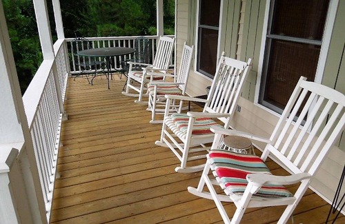 Main floor: Large porch with lots of seating, 3 bedrooms (Q, Q, F), 2 full baths (tub/shower), greatroom, eat-in kitchen, laundry & pantry. Top floor: open floor (5 T, 1 futon with top T bunk), sitting area with tv, full bath (shower- no tub).