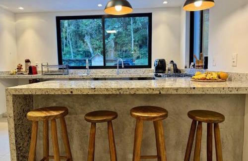A recently renovated vacation home, Serra Nevada House offers accommodations in Nova Friburgo. This property offers a private pool, free Wifi, and free private parking. On clear days, guests can head outside to enjoy the vacation home's outdoor fireplace or simply kick back and relax. Providing a balcony with mountain views, this vacation home also provides guests with a flat-screen TV, a well-equipped kitchen with a dishwasher, an oven, and a microwave, as well as 5 bathrooms with a walk-in shower and a hair dryer. There's also a seating area and a fireplace. A children's playground is also available at the vacation home, while guests can also relax in the garden. Eduardo Guinle Stadium – Friburguense A.C. Is 7.2 miles from Serra Nevada House, while Sesi is 7.5 miles away. Santos Dumont Airport is 86 miles from the property.