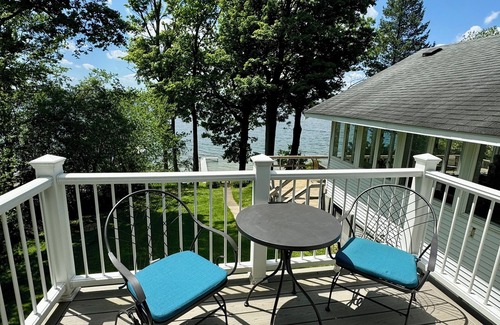 - Oversized Master Suite with queen bed, large closet, gorgeous lake views, access to the brand new private deck, and an ensuite bathroom with tub/shower, sink, and toilet. Note: there are two steps from the main floor to get to the master bedroom area.