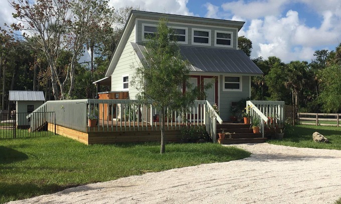 Eclectically decorated-Bringing nature in doors. Distressed Butcher block countertop w/a wash pale sink, Exposed pipes in the kitchen & shower w/ Edison lights for the industrial, yet nostalgic look. An antique-claw tub outdoor shower. FRESH & CRISP sheets on a brand-new King & Queen size Beautyrest mattresses. Premium pillows round off a restful nights rest/sleep. A great deal of care went into the build & décor, as we are continuously having family & friends visit & wanted a place for them, that was just as comfortable as my own home. No sofa indoors, only outdoor living area, however there is a 3 sided wrap around porch with gliders that can be moved/rearranged/relocated with ease. Situated on just over 2 acres, nestled next to the river. RV & boat trailer parking on site, Large fishing dock. Private driveway, Secure grounds, Pet friendly, large dogs ok, ^^^PET FEE IS FOR 1 ANIMAL, extra pets are subject to additional fees due upon arrival****Or added to your bill. Honesty is best policy! This fishing community is extremely laid back & quiet. The streets roll up early & there's VERY limited nightlife! Our crime rate is ultra low, our Sheriff William Snyder - doesn't mess around! We are approx. 10 miles from both I-95 & Florida's Turnpike, making it a convenient stop for travelers. An array of birds gather around the many feeders, providing soothing melodies. Manatee are year round in Florida and can be observed with ease from the rockers on the covered porch. Occasionally seeing a small alligator (they are native here folks) or the otter can been witnessed playing on the dock/water. on the dock, under the heavenly skies & is ideal for late night star gazing with a glass of fine wine & your best friend. 2 lounge chairs also for sunbathers. Newly planted, Thick, Dark Green Bamboo, Palm & Cypress trees are prominent, providing that extra layer of desired privacy. Our "Florida Shack in the Back" was a small building that came with the home we purchased in 2013, that we commonly referred to as The Shack. We watched the sun rise & set for 2 years before we finally decided on the desired layout & possible amenities it would include. The final product was more than we imagined. We are pleased to share our home with you & your family during your travels through our beautiful state.