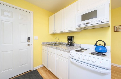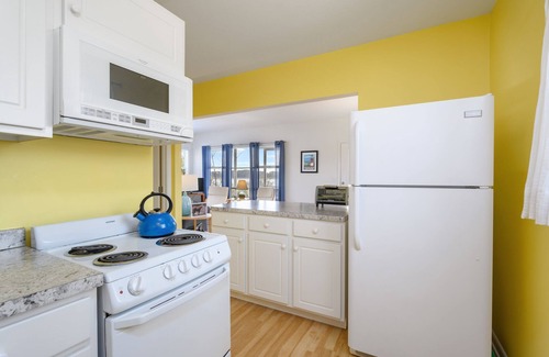Brilliant blues and yellows continue in the Master Bedroom, which has a comfy Queen Bed, and beachy white furnishings. You’re sure to wake refreshed and ready to explore our beautiful Little Island by the Sea in the morning. The Full Bath is decorated with Colors of Sea Glass, and has a Walk-in Shower, and is convenient to both the Bedroom and the Living Area.
