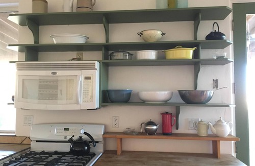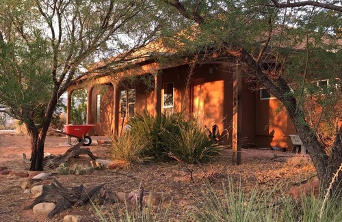 Southwest style home with saltillo tile floors, wood burning fireplace, large shaded porches and mature trees with amazing, unobstructed views of the Grand Staircase Escalante national monument and Navajo Mountain. 3 bedrooms and one sleeper sofa in the TV room will accommodate 8 guests in comfort. Two of the beds are custom built, king size sho sugi ban platform beds. If you are interested in this ancient Japanese technique of using fire to blacken and preserve wood, I will be happy to explain the details of the construction. This house is located in Big Water, UT - 20 minutes to Page, AZ, 10 minutes to Lake Powell beaches, 0 minutes to privacy, spectacular views and dark skies. Oregano, Rosemary, Lavender and Thyme in the garden are available for cooking, or just to scent your pillow while you sleep. You will be in easy driving distance of beautiful parks and monuments, such as Antelope Canyon, Horseshoe Bend, Lake Powell, the Grand Staircase Escalante national monument, the Paria wilderness, Zion's National Park and the north rim of the Grand Canyon. The house sits above Wahweap creek, and you can hike along the rim for spectacular views, or drop down to explore the creek and many side canyons on foot, with a trailhead just a few blocks from the house. Away from the lights of town, the stars are brilliant, perfect viewing for meteor showers. Come and find your oasis at Lake Powell!