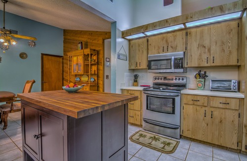 The large open kitchen offers plenty of room for several cooks, with stainless steel appliances, lots of counter space, a butcher block island and;