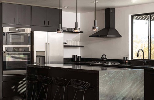 The modern kitchen is fully equipped for preparing meals with stunning views.