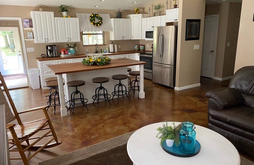 Beautiful country setting near several lakes and tons of wild live. Home has a covered porch, deck, polebarn, firepit, and charcoal grill. Huge yard and space for parking. The nicely decorated interior has stained concrete floors, 2 full-size bathrooms-one with a double-head shower and attached closet/laundry room. The master bedroom has a king-size bed w/tv and the other has a queen bed w/tv. The living/kitchen area is an open concept w/plenty of room for a queen blowup mattress (included). The attached scenic enclosed porch has plenty of space for another blowup mattress if you so desire. This is a very nice place with the comfort of your own home.
