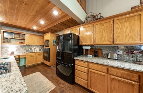 This charming cabin spans over 2,500 square feet and boasts three spacious bedrooms, two and a half bathrooms, and multiple living areas that allow for ample space for you and your loved ones. The great room features soaring wood ceilings, gorgeous hardwood flooring, and a beautiful stone fireplace to keep the ambiance warm during your celebration. The fully equipped kitchen is perfect for catering your event, while modern amenities like flat-screen TVs and high-speed internet ensure everyone stays entertained. Step outside to enjoy the expansive deck and cozy fire pit, ideal for gathering with family and friends after the festivities.