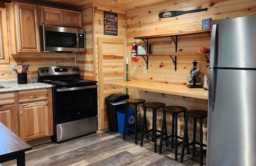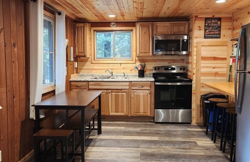 This beautifully updated cabin features a newly renovated, fully equipped kitchen and a modern bathroom with a full walk-in shower. With space to comfortably sleep up to 9 guests, it’s perfect for families or groups. Bedroom One boasts two queen beds, while Bedroom Two offers a queen bed and twin bunk beds. The cozy living room includes a queen sofa sleeper, brand-new furniture, a Smart TV, and fresh carpeting installed in 2024. The cabin also shines with updates like new queen beds and a durable new metal roof.