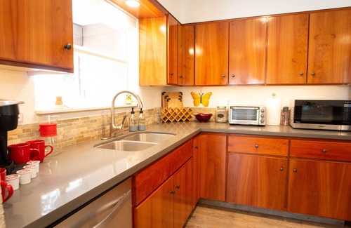 The entire home and property are available for your use. There is free parking in the driveway for up to 4 vehicles. Additional curbside parking is available in front of the house, on the street. Three bedrooms with queen beds sleep 6, plus a roll-away twin and the couch offer supplemental space for 2. Linens provided for 8.