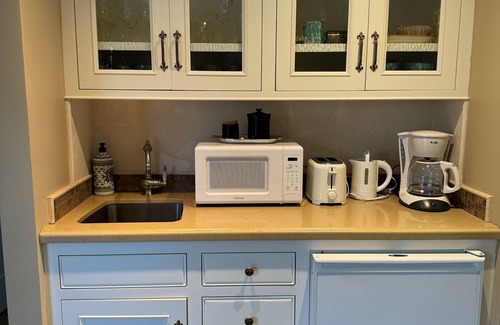 All the creature comforts are included - fluffy towels, puffy comforter and high thread count sheets. Microwave, coffeemaker, kettle, toaster, small under-counter refrigerator with ice maker, coffee and teas are stocked for you. However, it is not a full kitchen. No stove or oven. Clawfoot tub with shower, not walk-in. NOT suitable for guests with mobility issues.