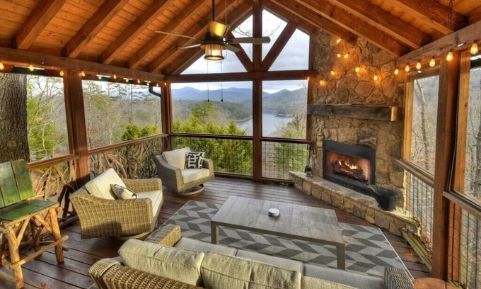 The main level porch has outdoor seating, a stone wood fireplace, and a bar to help you enjoy lounging while soaking up the gorgeous view.