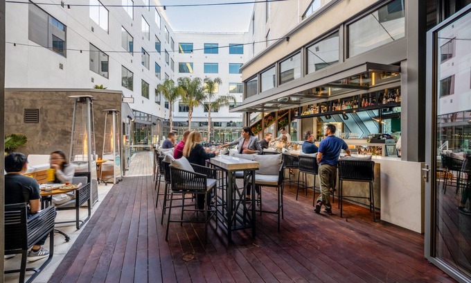 An outdoor pool and a hot tub are on site. Other recreational amenities include a sauna, a 24-hour fitness center, and complimentary bicycles.