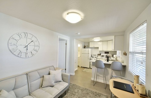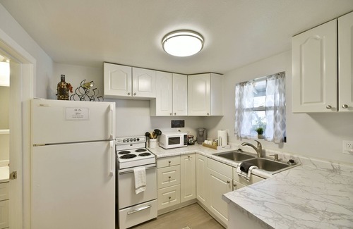 Very Popular downtown cottage. Downtown Mt Shasta with Mt Shasta Views and within a cluster of four vacation rentals that share a gorgeous landscaped yard with flowers, grass. Bella is a one bedroom, one bath cottage with all new decor. Its small but efficient. Living room has Delightful Farmhouse décor cottage.Futon couch that sleeps one comforatble. Kitchen is fully stocked with all cookware, stove, fridge, eating bar with 2 chairs. Additional small table with two chairs also. Full bathroom with tub/shower, sink. Bedroom has queen bed and chair with large closet. Linens and towels provided. Small dog ok with fee. All fresh, light & NEW.42"smartv with strong wi-fi.Fully equip. Covered Deck has patio chairs and small bbq, Grassy yard area.. Views of Mt Shasta. Walk to crystal shops, restaurants, shops. Gourmet supermarket across street. Laundry on site. Bella is one of 4 vacation rentals in Chestnut Street Village Vacation rentals. Rent one or all.