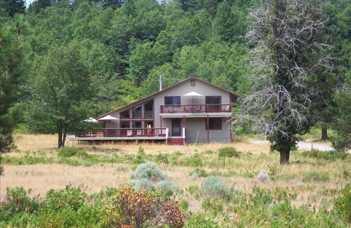 This spacious three bedroom, two bathroom chalet is located six miles north of central Mount Shasta. It's panoramic views of Mount Shasta, Shastina and Black Butte, are seen from nearly every room in the house. Located on 35 acres, the home is on a beautiful natural meadow that backs up to a forest of tall pines. In addition to having all the modern conveniences, the home has two large decks, one off the master bedroom and the other wraps around the front and side with a hot tub, and sauna both facing the awesome mountain view. The house is easily large enough for one or two families yet cozy enough for a romantic getaway.