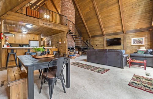 This wonderful A-Frame is striking from the exterior and throughout the interior! It offers a balance of modern and cozy cabin vibes. With 1 bedroom and a loft - the main bedroom is on the main floor across from the full bathroom. Head upstairs to the loft where you’ll find 3 additional beds. The loft offers a wonderful view, with all of the windows and a private patio.