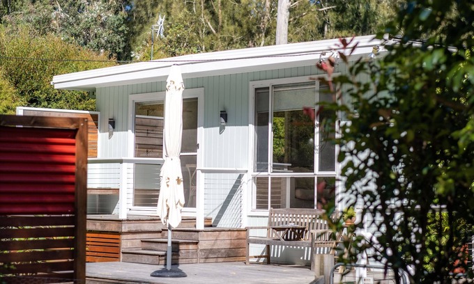 It has 3 bedrooms (2 with Queen beds, one with a King bed) and beautiful outlooks including bush behind the property and a large back lawn. There is a bathroom with a large shower and a separate bath and toilet, plus another separate toilet. Laundry and washing machine is separate in the house with plenty of storage if needed. A Weber BBQ is on the main deck for outdoor eating.
