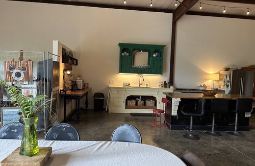 The Studio at Green Pastures is one of the most unique spaces you'll find anywhere! The view thru the over sized glass garage door is breathtaking. You can watch our flock of Katahdin sheep (and other animals) grazing in the pasture just outside. The space is used as an Art Studio and is decorated with an artistic coffee shop theme. The space boasts a small stage, 84 inch TV, multiple tables set up with games and books (to resemble a coffee shop), lot's of art, a full kitchen, coffee bar, etc. The space has an open floor plan with beautiful concrete floors and has the feel of a loft or Barndominium.