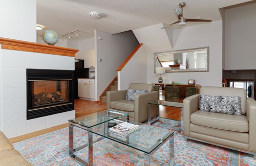 The main level is divided by a triple sided gas fireplace and features an open concept with the dining/kitchen on one side & the living room on the other. This fully furnished bright luxury 4-bedroom home is ideally situated if you are looking to stay in south Calgary near a plethora of amenities while providing an ample 2300 square feet of chic living space.