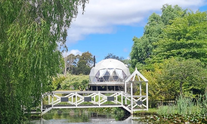 Sheffield brings to you a spectacular Dome. Designed for couples to experience a romantic cozy hideaway. Relax in the sauna and take a plunge in the outdoor tub, privately located in our garden overlooking a lake set in 3 beautiful acres, meandering pathways throughout, with waterfalls and wildlife in this special place. Platypus come and go as do small native marsupials and paddy melons. Spring, Summer, Autumn or Winter you won’t forget your time in this beautiful garden of wonder.