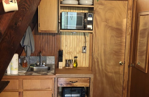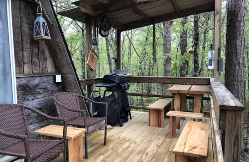 The tiny house has a total of 300 sq. ft and is an A-frame. There is a deck, partially covered. Nothing fancy here but it has everything needed for a comfortable stay. Cozy you might say. AC and heat of course. Understand, with such limited space everything is small. (except the bed! it's a queen, some things can not be compromised!) Amenities include a small Mr. Coffee, french press, coffee grinder, and electric kettle. (coffee beans, earl gray tea and the fixins' are provided) For indoor cooking there is a microwave, toaster oven, “Liddle Griddle” and mini crock pot. On the deck is a gas grill with a side burner. There is a fire ring to the front of the cabin and long sausage/dog forks as well as a burger/fish/anything else basket for open fire cooking. Yum (one nights firewood is provided)