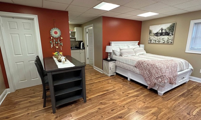 Beautiful location on a working family farm. This cozy one bedroom studio is equipped with a comfortable queen bed, luxurious pillows and bedding. Twin rollaway is available if needed for children or additional guest. Night stand charging stations and lights, dinner table is large enough for 4 guest or to work remotely. Independent unlimited stable internet provided. Kitchen is stocked with a microwave, mini fridge/freezer, hot plate, electric skillet, pots/pans, crockpot and toaster. Also has a keurig coffee pot, variety of coffee pods, creamers and teas. These is also a 5 burner grill w side burner for outdoor cooking.
