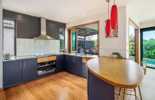 The open-plan living, kitchen and dining area is spacious and well-equipped to accommodate large families or groups of friends. Illuminated by natural light, floor to ceiling glass windows welcome the sound of crashing waves and beautiful sea breezes. Featured throughout the home, a seamless transition is achieved by these windows to invite the beauty of the outdoors inside. Relax into the large, comfortable couch in the spacious living room or master your culinary skills in the kitchen and cook up a storm. Equipped with all the necessary appliances and utensils, this kitchen features island bench seating and a serving window for convenience. Overlooking the lavish lap pool, this living space extends out to an alfresco outdoor area complete with dining table and room to relax and soak up the serenity of Shelly Beach.