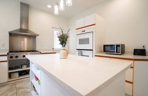This home has not one, not two, but three separate kitchens! The largest kitchen is located on the upper floor. With stainless steel appliances, a gas oven range, and a large center island, it's the perfect place to whip up meals for your stay. A second bar with a dishwasher and minifridge is located in the main living and dining area.