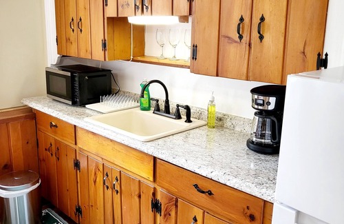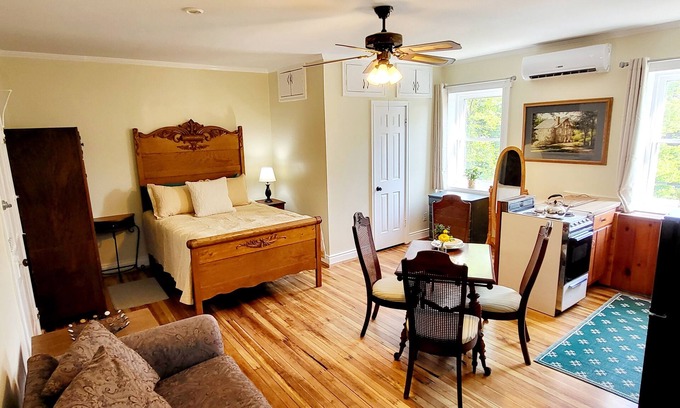Kick back and relax in this calm, stylish space. The Shepards Suite gives you some neat pieces of the historic Manor House at Gayfield, that was once a large sheep farm! The bathroom boasts a back wall of the exposed original brick from 1848, and the great room features the heart pine flooring and elaborate molding from original construction. The full kitchen is outfitted with a 20" range with oven, microwave, and a 7.3 cu. ft. refrigerator with basic cookware so you can enjoy a evening in!