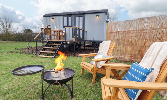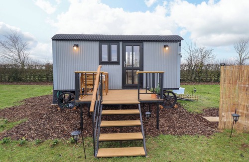Shepherds Hut - Ash, a single-storey hut, consists of a studio-style layout including a king-size bed, kitchen, breakfast bar with stools and sitting area as well as a shower room with walk-in shower, basin, and WC. There is a one-ring induction hob, microwave, slow cooker, air fryer, fridge with freezer compartment, kettle, toaster, complimentary tea and coffee as well as WiFi. There is a wraparound garden with lawn, decking, firepit, furniture, and wood-fired hot tub, plus off-road parking for 2 cars. Two well-behaved pets welcome, but sorry, no smoking. Fuel, power, starter pack of logs, bed linen and towels inc. in rent. Within 2.4 miles, you will find a pub, and within 2.8 miles, a shop. Treat your loved one to a stay in the countryside at Shepherds Hut - Ash. Note: There are steps up to the exterior of the property. ....Note: Adults only ( no children/ babes in arms - sorry )