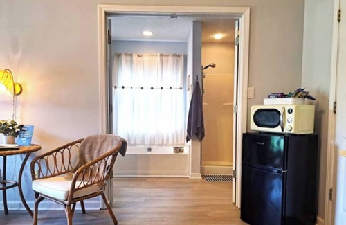 The dry kitchen (no sink or cooking facilities) has a microwave, small fridge, Keurig coffee maker and more. The attached bathroom with walk-in shower, twin sinks and relaxing bathtub are great for working guests or vacationers.