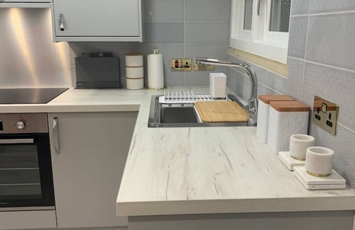 The kitchen area has a built in fridge, induction hob, electric fan oven, lots of worktop space to cook and a large sink with instant hot water and a filtered drinking water tap. The kitchen is fully equipped with everything you should need. There is a breakfast bar with two Bar Stools.