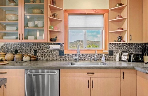 Shining Mountain is NOW a 3 Br./2.5Ba./Den plus office which can be locked off to a 2br./1.5 bath option on request basis only. Reviews for the past few years can be found under the 2 bedroom option and we encourage you to take a look! There are mountain biking and hiking trails called The RAT trails (Ridgway Area Trails) less than a mile away. Close to ski areas and Ouray Ice Park! My favorite place to sit is on the deck facing the mountains – it’s a big and inspiring view. When I enter the solace of my special home, the world makes sense, my worries fall away and I am at peace. You will understand once you arrive. There are two bedrooms, both with queen beds, and one and a half baths. Even the bathrooms are unique. The living room and kitchen layout creates a spacious great room, that is also a cozy gathering place. It is really pretty. There is a TV in the living room with Apple TV to access your Apple account (or Hulu and Netflix), so you can enjoy a movie. I have a newly remodeled kitchen with new appliances including a 36-inch gas, six-burner cook stove and oven. If I were you, I’d use the new gas grill on the deck and enjoy a meal at home. The kitchen is well supplied with nice cookware, and is a great place to prepare a home-cooked meal. Ridgway also has some sweet boutique restaurants and is starting to appeal to the foodie scene. If you extend your stay, you are welcome to use the laundry room or the garage, to dry out your wet gear in the winter. There is plenty of space in the garage on the carpeted floor to sort and leave your gear. Once you arrive, you will never want to leave. Please care and love my home as much as I do! My house sits on five acres, only two miles from downtown Ridgway. It is close to amenities, yet it feels far away. You will feel inspired by the stunning views of the Mt Sneffels Range, surrounded by gorgeous farmland and pinion juniper woodlands. There is a private residence off the garage that owner uses on occasion. We are quiet and respect the privacy of our guest enjoying the main portion of the house which is very private. Must have a vehicle and during winter we recommend All-wheel or Front-wheel drive or 4 x 4.