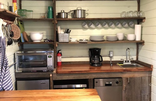 The house is built using two 40' metal shipping containers as the interior frame. It is unique and charming and made with old cypress and pine wood that was reclaimed from other building on the property that were built over 100 years ago.. We have miles of pet friendly, well maintained farm roads that are great for walks, jogging and cycling (when dry).