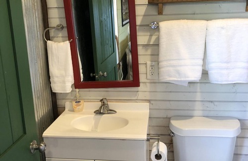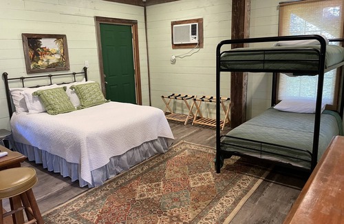 This farmhouse located on 500 acres, is a 2 room/2 bath house. One room has a efficiency kitchen (2 eye electric cooktop, toaster oven, microwave, small dishwasher and small refrigerator) open den area (tv) with a full bed tucked away with a privacy curtain and full bath. The second room has 2 bunk beds, tv and full bath. Outside on the back porch is a propane grill and a washer/dryer closet.