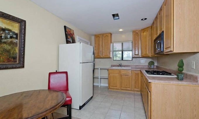 Make yourself at home in this full private studio apartment located in Camarillo, California. This unit has it's own full kitchen, bathtub/shower, and walk in closet. A full refrigerator, stovetop, microwave and sink, offer you all the amenities you need to create your home away from home. The apartment unit, which accommodates visitors with a Queen bed and Full fold out leather sofa, also has a flat screen television to relax with. The house has cable and WIFI included. Elegant Mediterranean furniture sets off the tone of the room, which also features seating for at home dining. There is a spacious walk in closet to hold all your belongings, and a bathroom with a shower/tub combination.